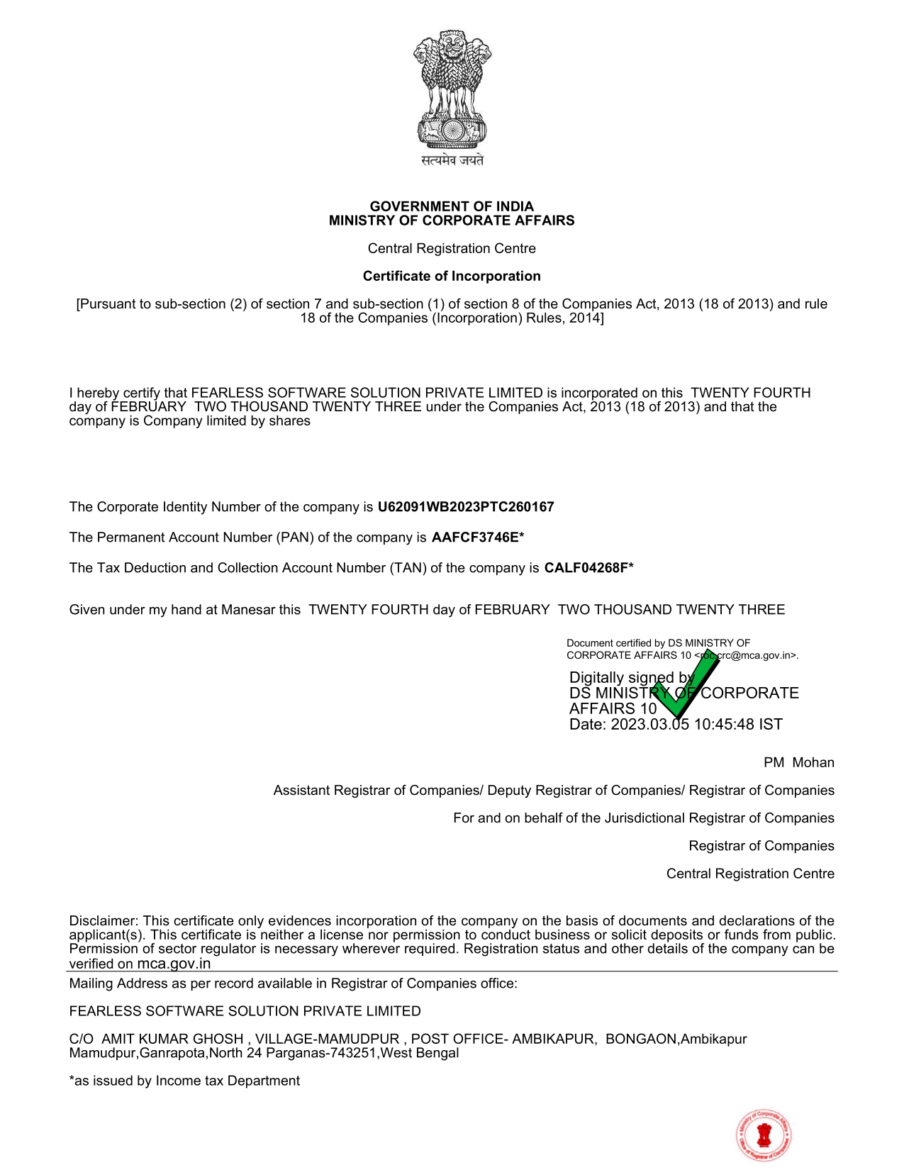 Issued by the Ministry of Corporate Affairs (MCA), Government of India.