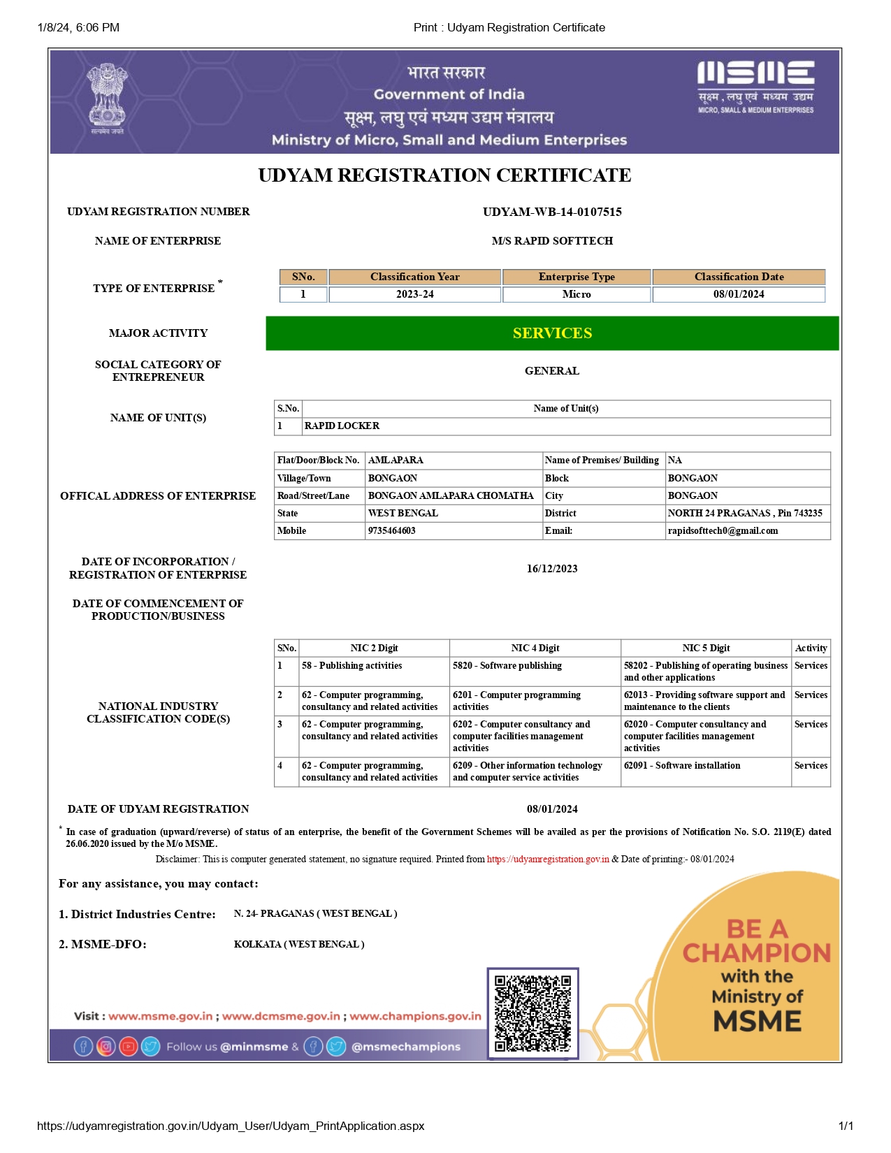 Registered as a Micro, Small and Medium Enterprise under the Ministry of MSME.